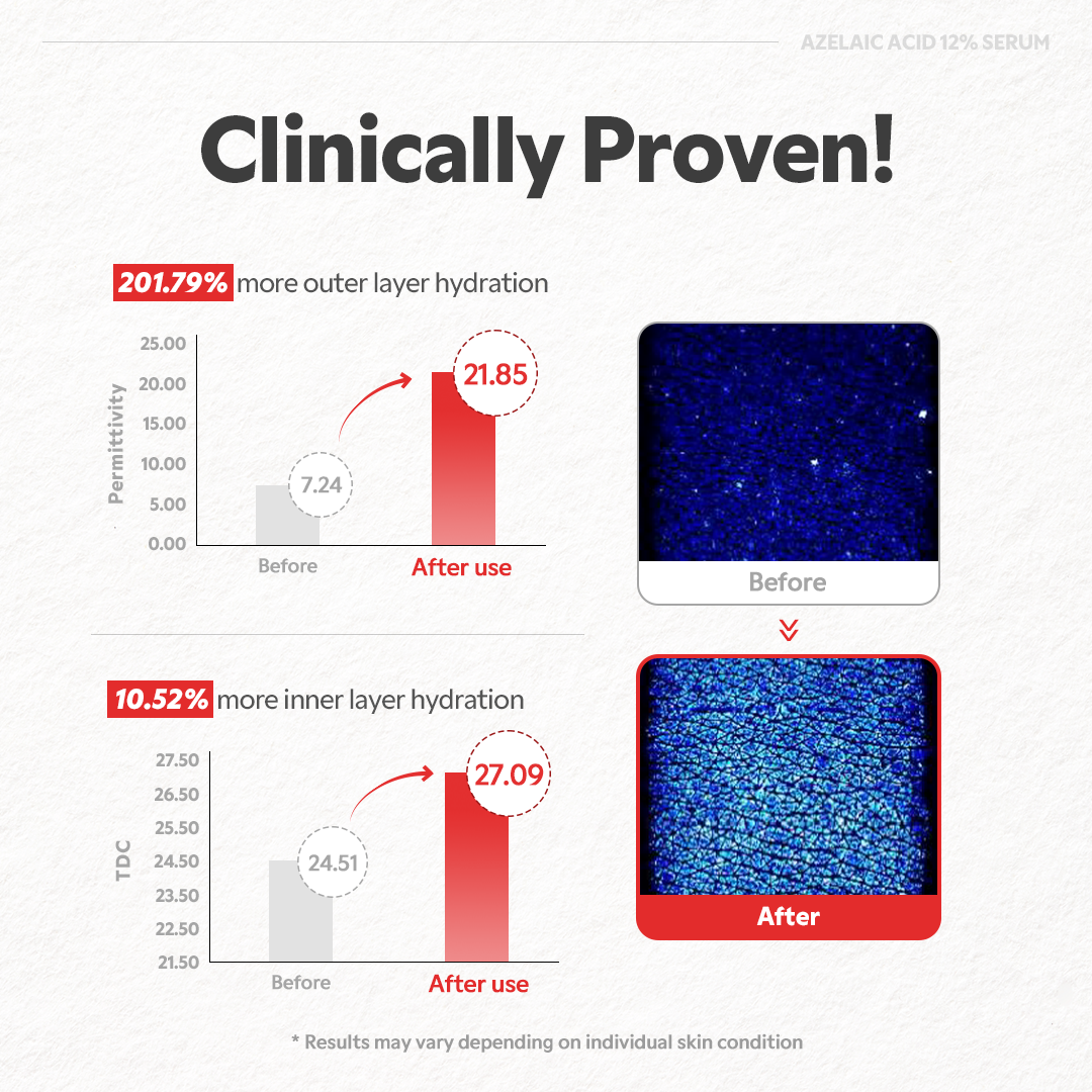 12% Azelaic Acid works to unclog pores, smooth texture, and fade post-acne marks—without harsh irritation.